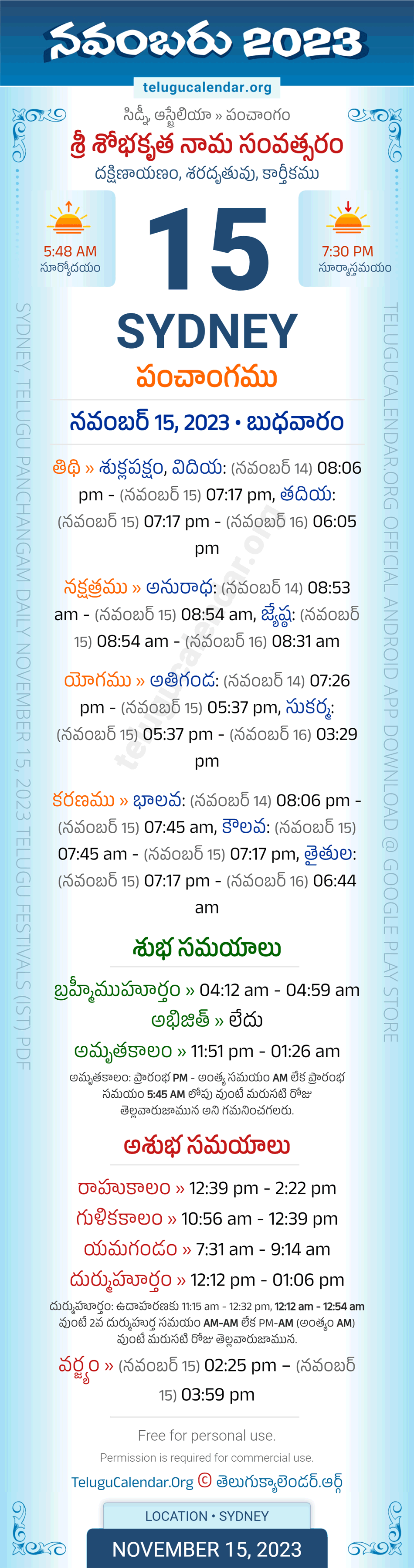Download » November 15, 2023 » Sydney (Australia) Telugu Panchangam Daily Sheet with Auspicious and Inauspicious Timings.