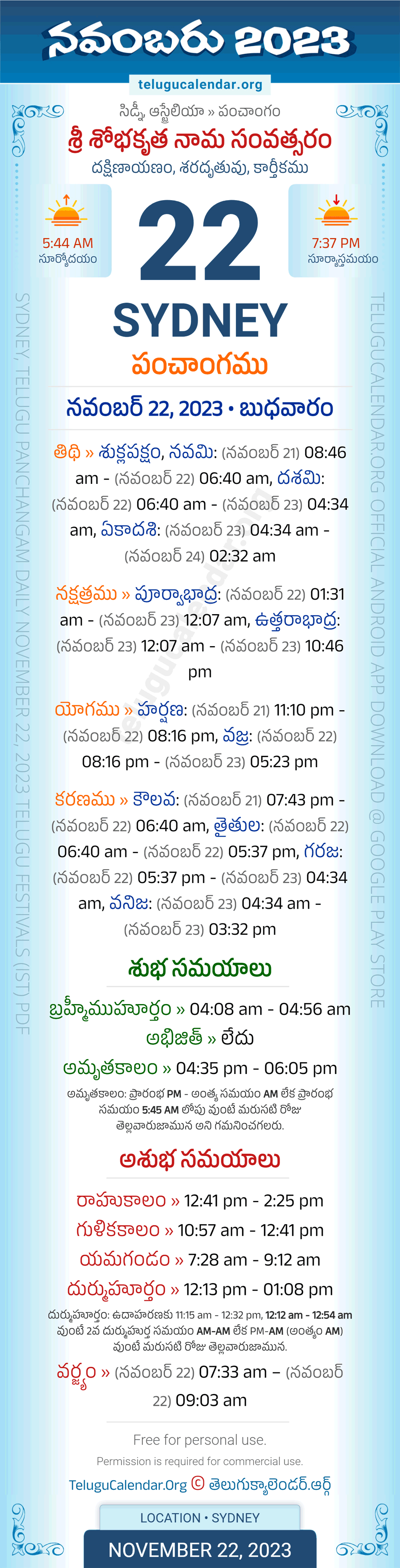 Download » November 22, 2023 » Sydney (Australia) Telugu Panchangam Daily Sheet with Auspicious and Inauspicious Timings.