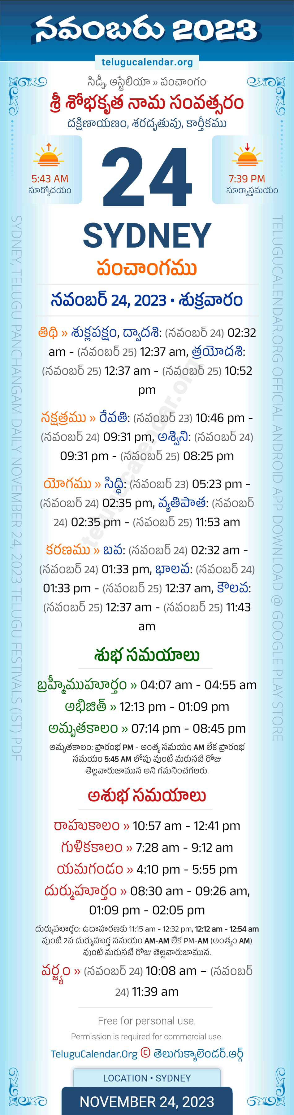 Download » November 24, 2023 » Sydney (Australia) Telugu Panchangam Daily Sheet with Auspicious and Inauspicious Timings.