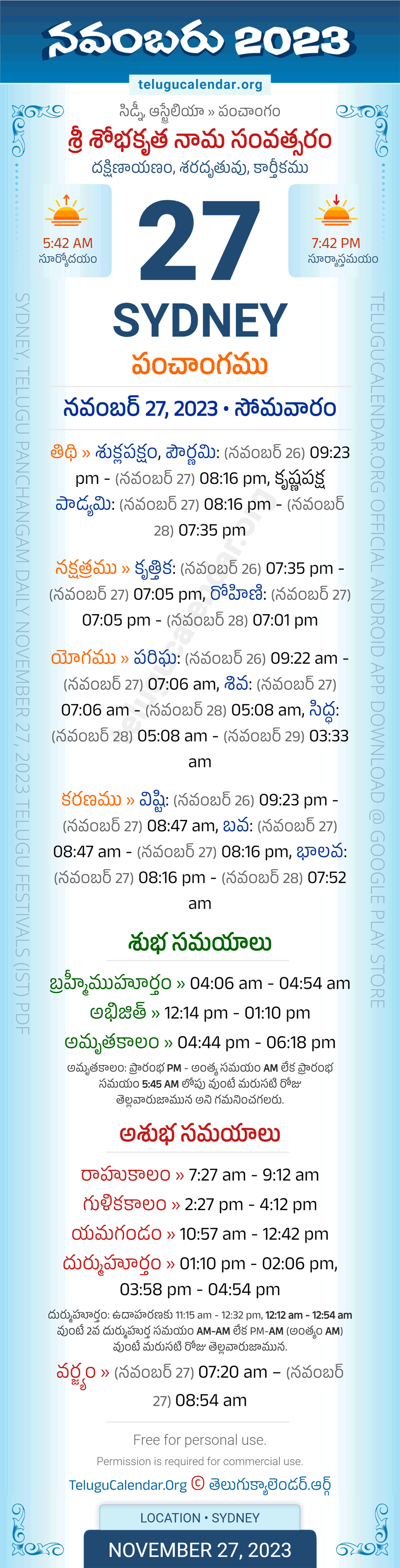 Download » November 27, 2023 » Sydney (Australia) Telugu Panchangam Daily Sheet with Auspicious and Inauspicious Timings.