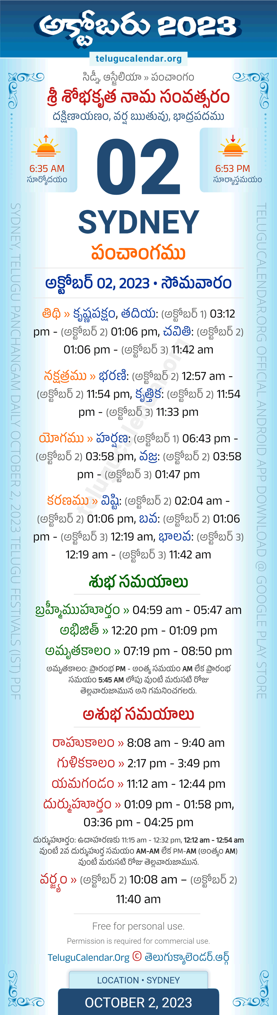 Download » October 2, 2023 » Sydney (Australia) Telugu Panchangam Daily Sheet with Auspicious and Inauspicious Timings.