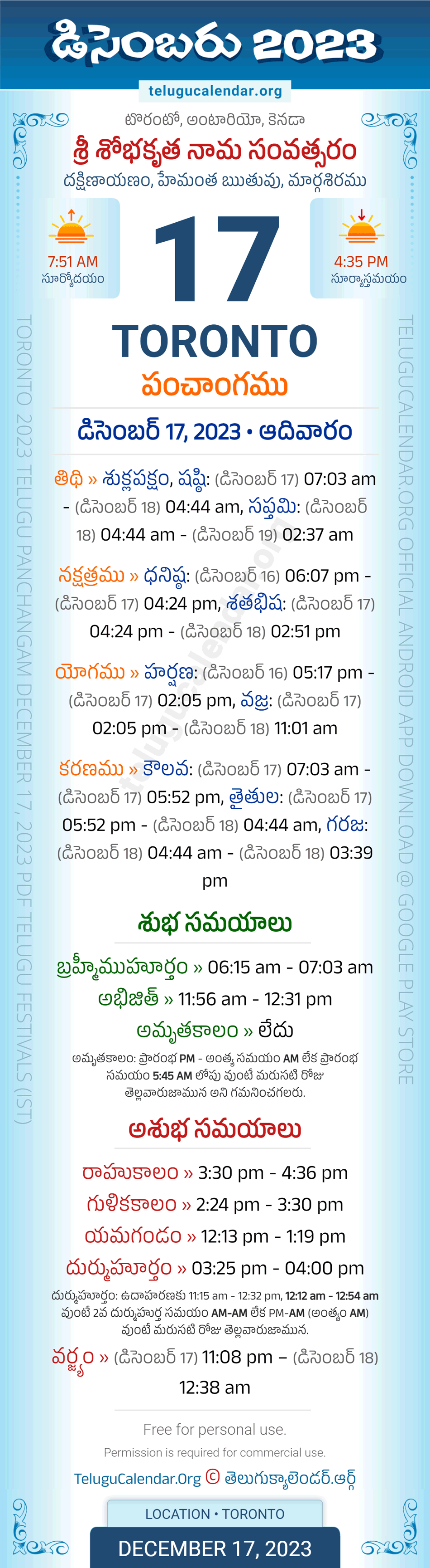 Toronto Panchangam December 17, 2023 Daily Sheet in Telugu... Toronto Telugu Panchangam Sunday, December 17, 2023, Today's Toronto Tithi: Sukla Paksham, Shashthi: (Dec 17) 07:03 am - (Dec 18) 04:44 am, Saptami: (Dec 18) 04:44 am - (Dec 19) 02:37 am, Today's Toronto Nakshatram: Dhanishta: (Dec 16) 06:07 pm - (Dec 17) 04:24 pm, Shathabhisha: (Dec 17) 04:24 pm - (Dec 18) 02:51 pm, Telugu Year: Sri Sobhakritu Nama Samvatsaram, Vedic Aayana: Dakshinayanam, Vedic Rutuvu: Hemanta, Chandramasa (Amanta): Margasiramu. Below image showing information about the 5 attributes of the day, viz., Varam, Tithi, Nakshatram, Yogam & Karanam along with starting and end timings. Read more