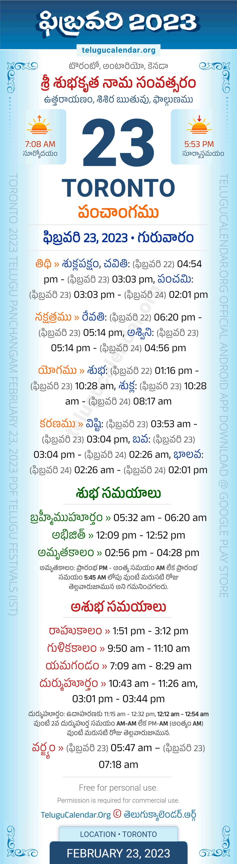 Download » February 23, 2023 » Toronto (CANADA) Telugu Panchangam Daily Sheet with Auspicious and Inauspicious Timings.