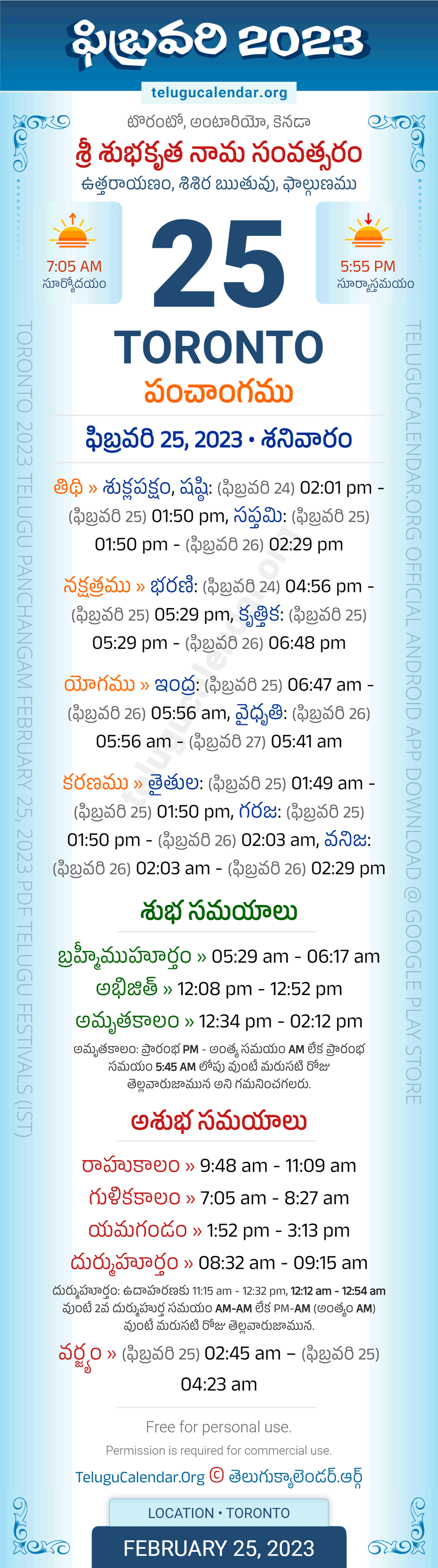 Toronto Panchangam February 25, 2023 Daily Sheet in Telugu... Toronto Telugu Panchangam Saturday, February 25, 2023, Today's Toronto Tithi: Sukla Paksham, Shashthi: (Feb 24) 02:01 pm - (Feb 25) 01:50 pm, Saptami: (Feb 25) 01:50 pm - (Feb 26) 02:29 pm, Today's Toronto Nakshatram: Bharani: (Feb 24) 04:56 pm - (Feb 25) 05:29 pm, Krithika: (Feb 25) 05:29 pm - (Feb 26) 06:48 pm, Telugu Year: Sri Subhakritu Nama Samvatsaram, Vedic Aayana: Uttarayanam, Vedic Rutuvu: Shishira, Chandramasa (Amanta): Phalgunamu. Below image showing information about the 5 attributes of the day, viz., Varam, Tithi, Nakshatram, Yogam & Karanam along with starting and end timings. Read more