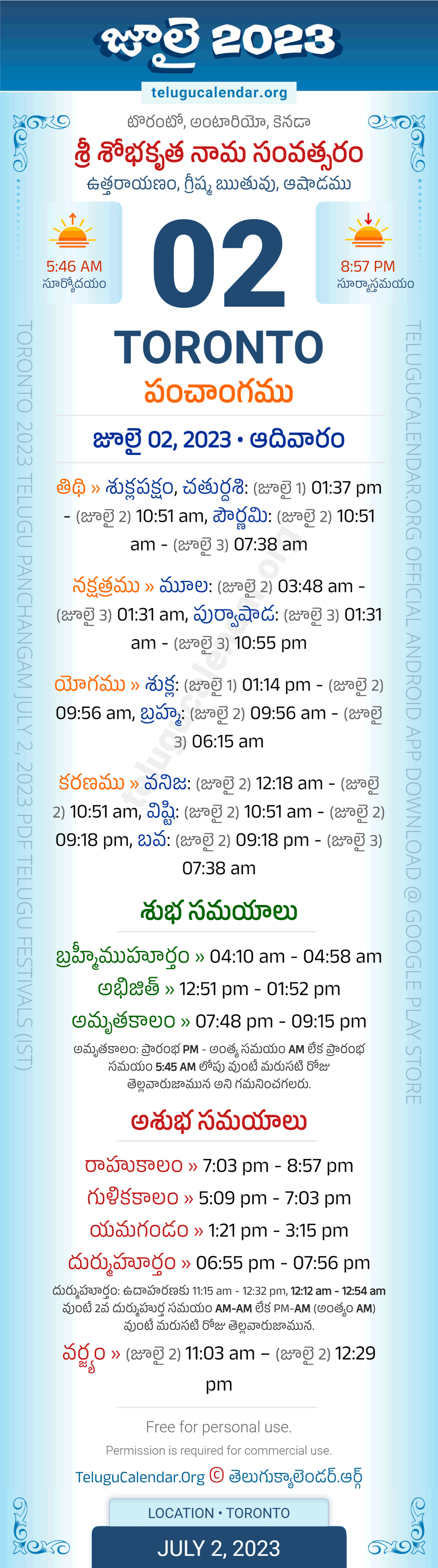 Download » July 2, 2023 » Toronto (CANADA) Telugu Panchangam Daily Sheet with Auspicious and Inauspicious Timings.