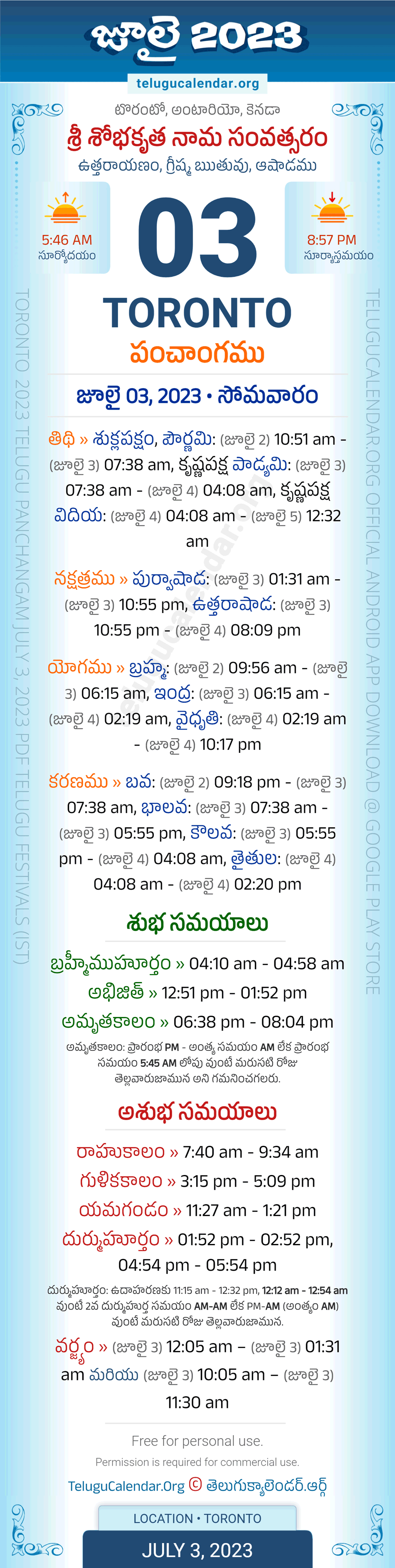 Download » July 3, 2023 » Toronto (CANADA) Telugu Panchangam Daily Sheet with Auspicious and Inauspicious Timings.