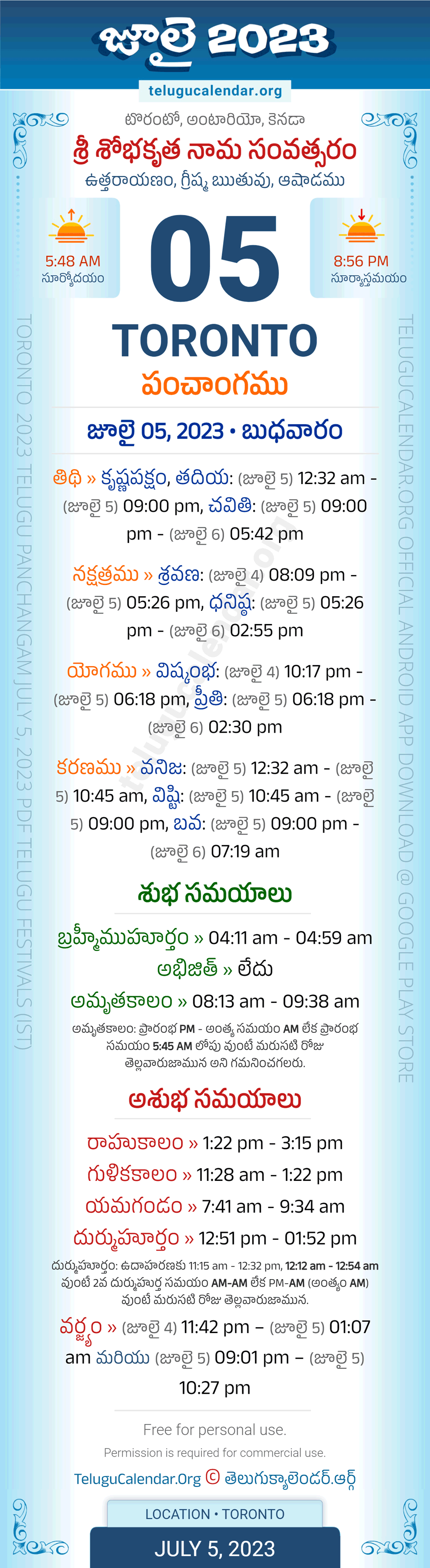 Download » July 5, 2023 » Toronto (CANADA) Telugu Panchangam Daily Sheet with Auspicious and Inauspicious Timings.