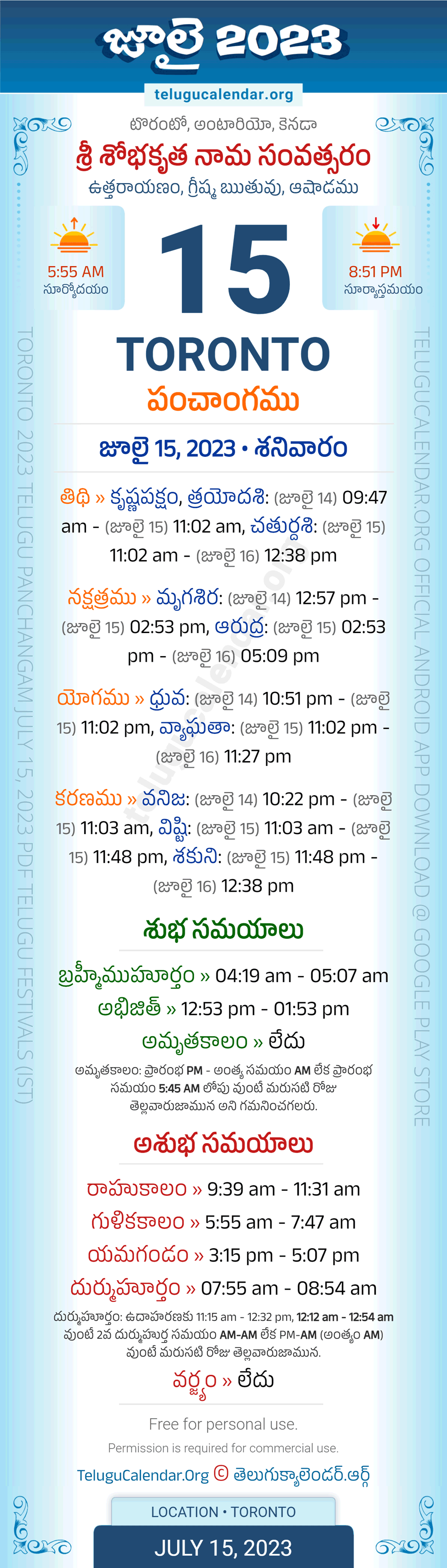 Download » July 15, 2023 » Toronto (CANADA) Telugu Panchangam Daily Sheet with Auspicious and Inauspicious Timings.