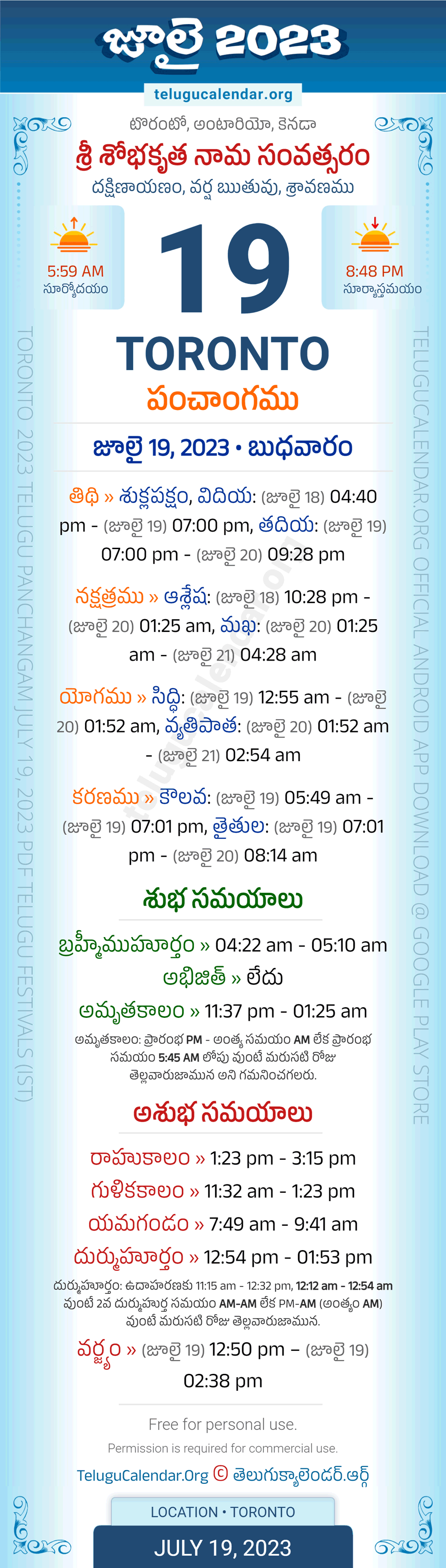 Download » July 19, 2023 » Toronto (CANADA) Telugu Panchangam Daily Sheet with Auspicious and Inauspicious Timings.
