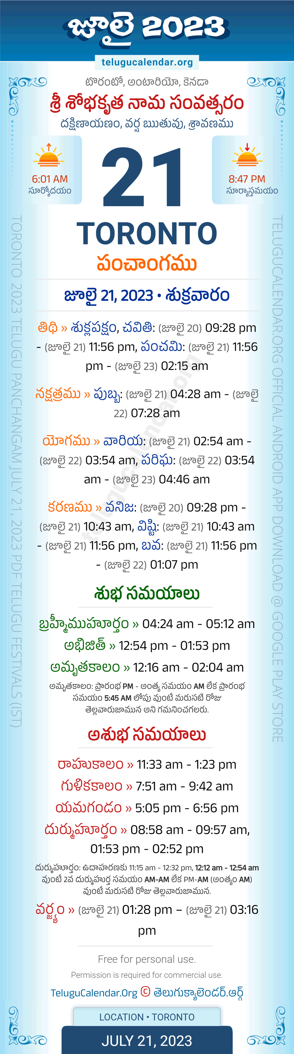 Toronto Panchangam July 21, 2023 Daily Sheet in Telugu... Toronto Telugu Panchangam Friday, July 21, 2023, Today's Toronto Tithi: Sukla Paksham, Chavithi: (Jul 20) 09:28 pm - (Jul 21) 11:56 pm, Panchami: (Jul 21) 11:56 pm - (Jul 23) 02:15 am, Today's Toronto Nakshatram: Purva Phalguni: (Jul 21) 04:28 am - (Jul 22) 07:28 am, Telugu Year: Sri Sobhakritu Nama Samvatsaram, Vedic Aayana: Dakshinayanam, Vedic Rutuvu: Varsha, Chandramasa (Amanta): Sravanamu. Below image showing information about the 5 attributes of the day, viz., Varam, Tithi, Nakshatram, Yogam & Karanam along with starting and end timings. Read more
