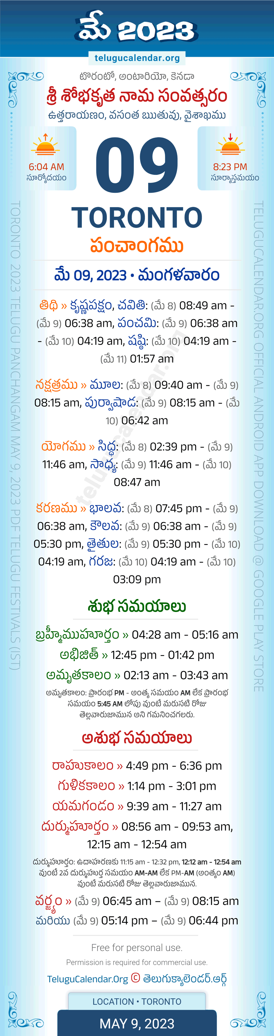 Download » May 9, 2023 » Toronto (CANADA) Telugu Panchangam Daily Sheet with Auspicious and Inauspicious Timings.