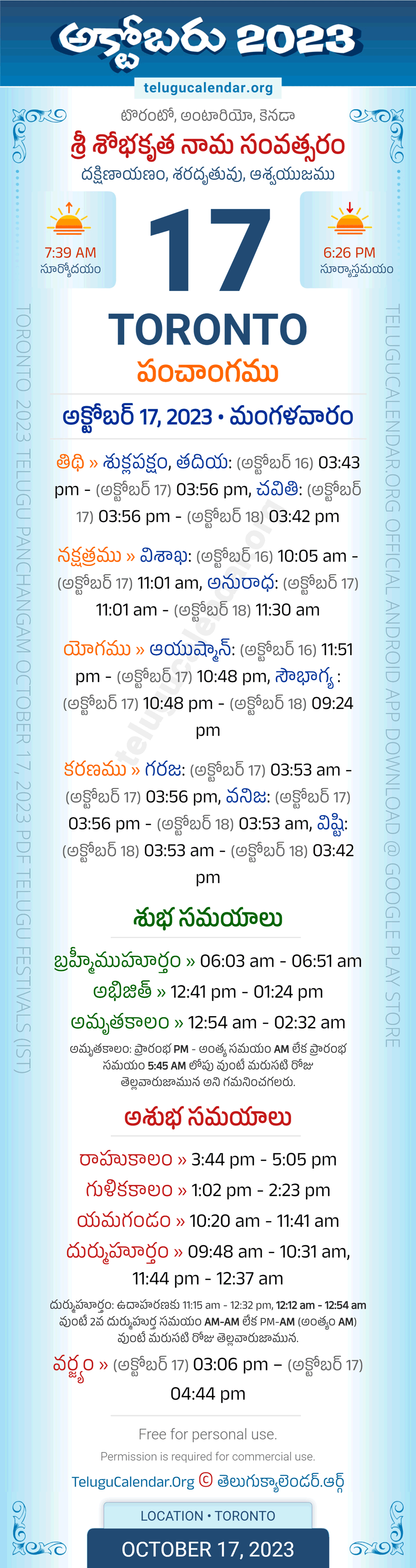 Download » October 17, 2023 » Toronto (CANADA) Telugu Panchangam Daily Sheet with Auspicious and Inauspicious Timings.