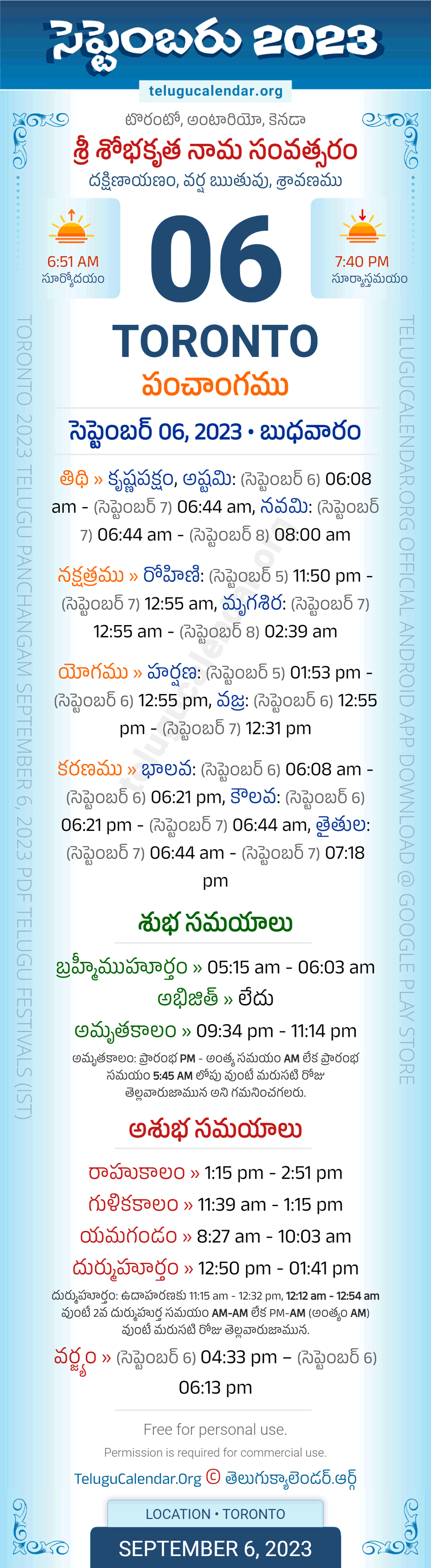 Toronto Panchangam September 6, 2023 Daily Sheet in Telugu... Toronto Telugu Panchangam Wednesday, September 06, 2023, Today's Toronto Tithi: Krishna Paksham, Ashtami: (Sep 6) 06:08 am - (Sep 7) 06:44 am, Navami: (Sep 7) 06:44 am - (Sep 8) 08:00 am, Today's Toronto Nakshatram: Krithika: (Sep 5) 11:50 pm - (Sep 7) 12:55 am, Mrigasira: (Sep 7) 12:55 am - (Sep 8) 02:39 am, Telugu Year: Sri Sobhakritu Nama Samvatsaram, Vedic Aayana: Dakshinayanam, Vedic Rutuvu: Varsha, Chandramasa (Amanta): Sravanamu. Below image showing information about the 5 attributes of the day, viz., Varam, Tithi, Nakshatram, Yogam & Karanam along with starting and end timings. Read more