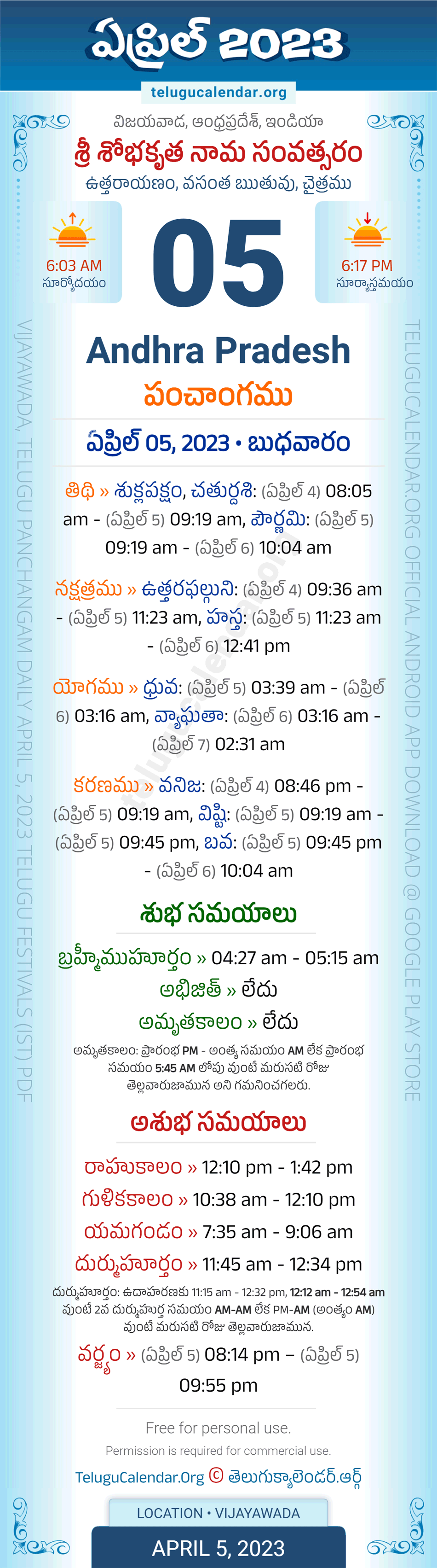 Download » April 5, 2023 » Andhra Pradesh (Vijayawada) Telugu Panchangam Daily Sheet with Auspicious and Inauspicious Timings.