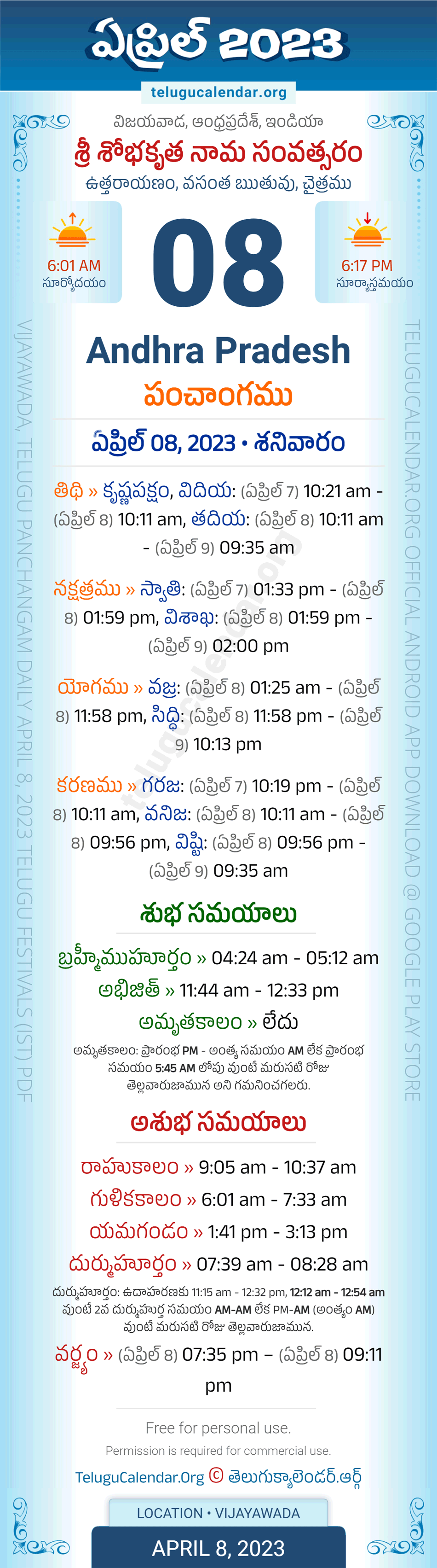 Download » April 8, 2023 » Andhra Pradesh (Vijayawada) Telugu Panchangam Daily Sheet with Auspicious and Inauspicious Timings.