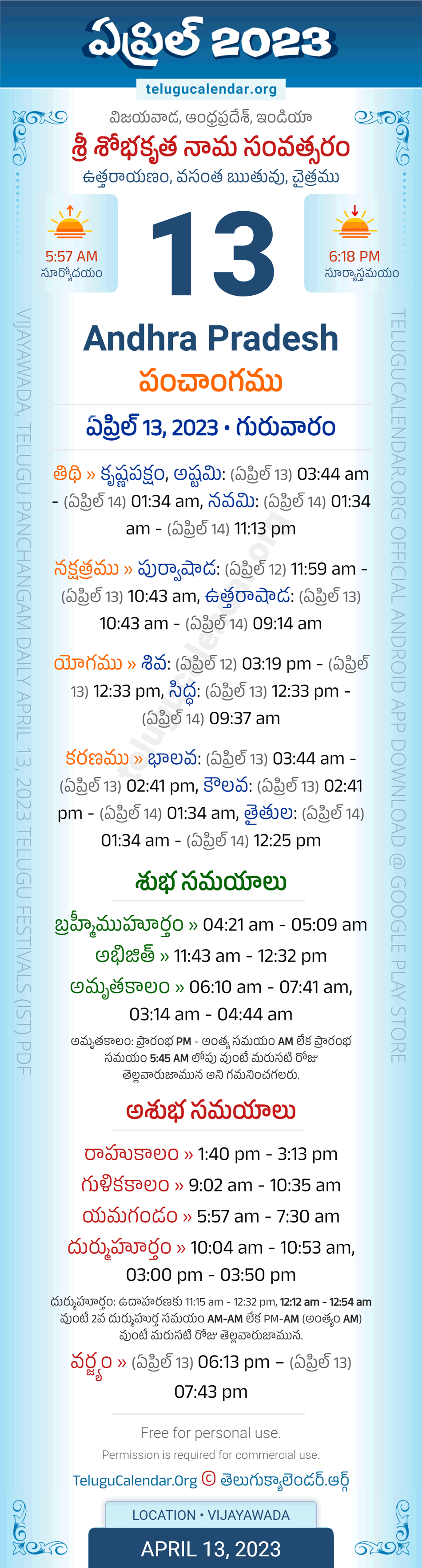 Apart from the Panchangam April 13, 2023 Andhra Pradesh Telugu Calendar Daily Sheet, you can also find the Sunrise and Sunset (Middle Limb) timings, Paksham, Telugu Year, Yanam, Rutuvu, Telugu Month. Today's Andhra Pradesh Auspicious Timings April 13, 2023 (Shubha Muhuratam Today Good Timings like Abhijit Muhurtham, Amruta Kalam & Brahma Muhurtham) and Today's Andhra Pradesh Inauspicious Timings April 13, 2023 (Bad Timings like Durmuhurtham, Rahukalam, Gulika kalam & Yamagandam) with starting and end timings in the above image.
