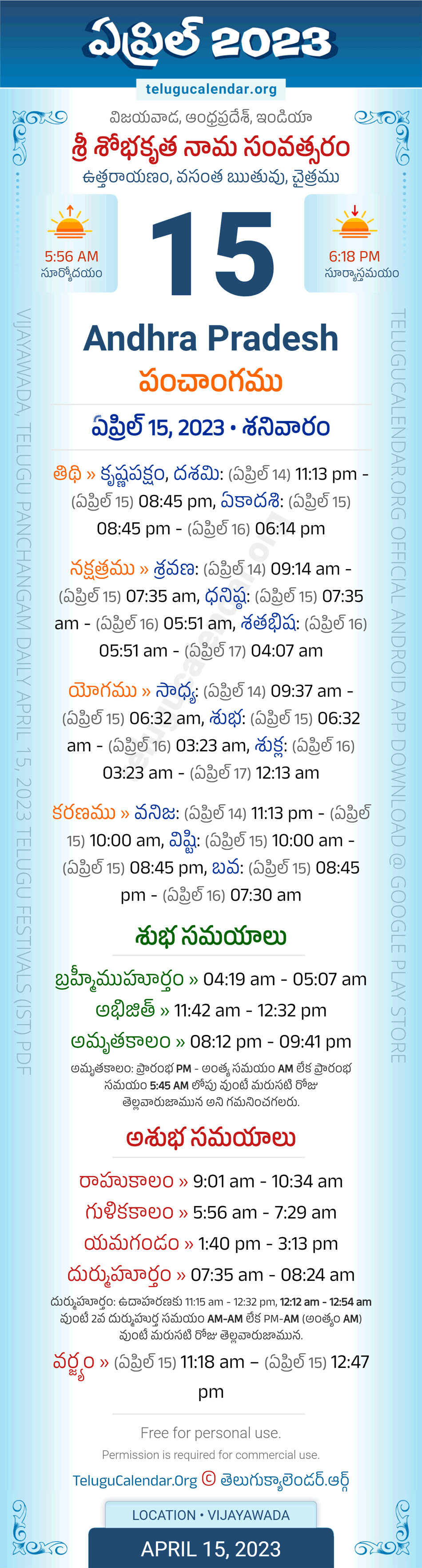 Download » April 15, 2023 » Andhra Pradesh (Vijayawada) Telugu Panchangam Daily Sheet with Auspicious and Inauspicious Timings.