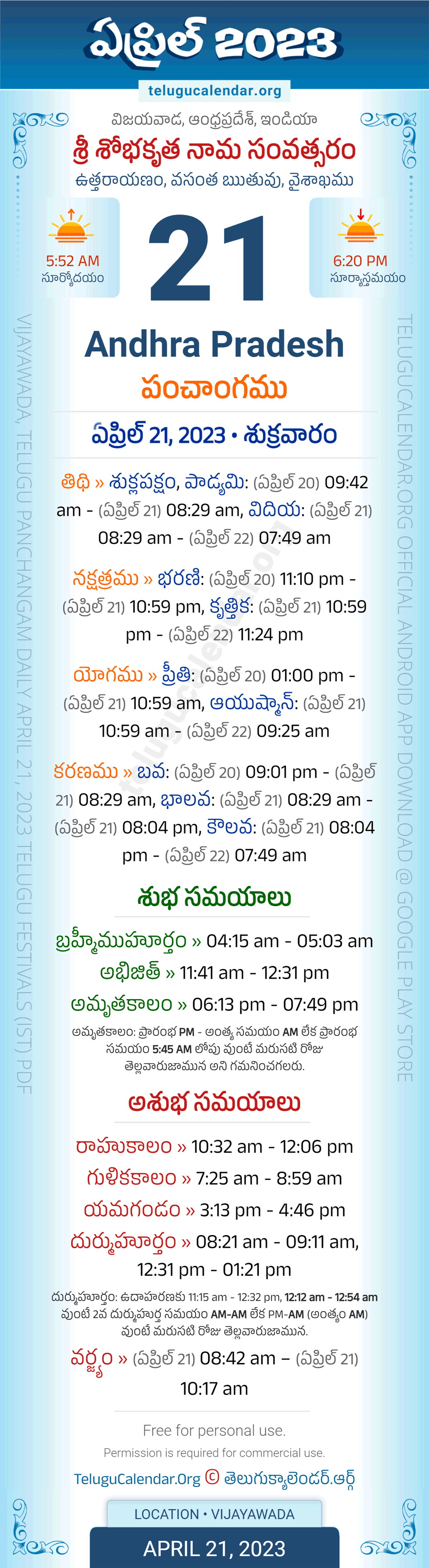 Download » April 21, 2023 » Andhra Pradesh (Vijayawada) Telugu Panchangam Daily Sheet with Auspicious and Inauspicious Timings.