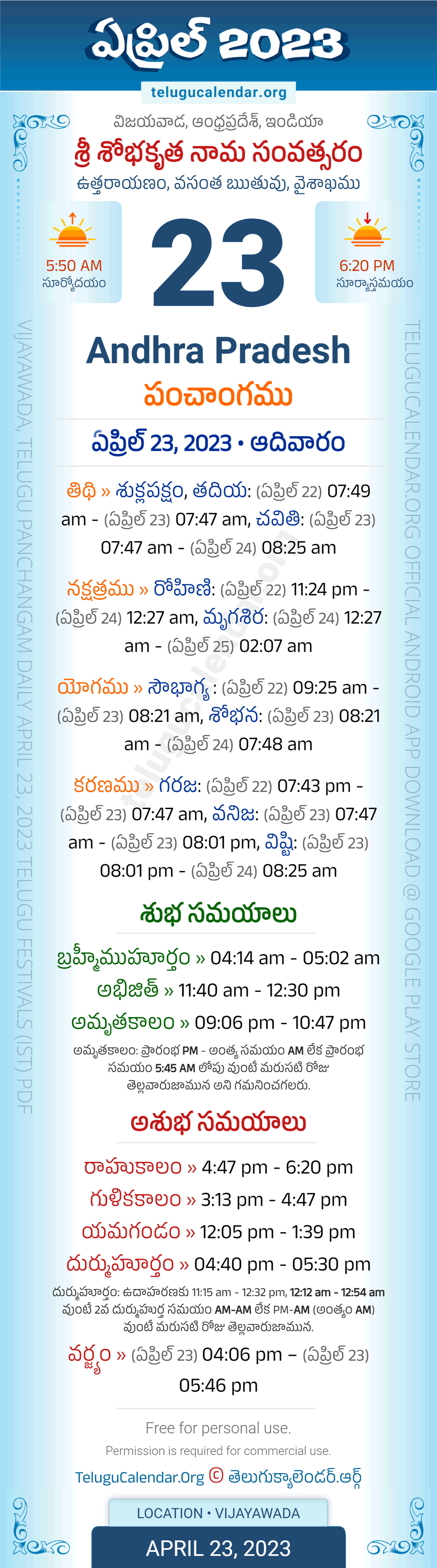 Download » April 23, 2023 » Andhra Pradesh (Vijayawada) Telugu Panchangam Daily Sheet with Auspicious and Inauspicious Timings.