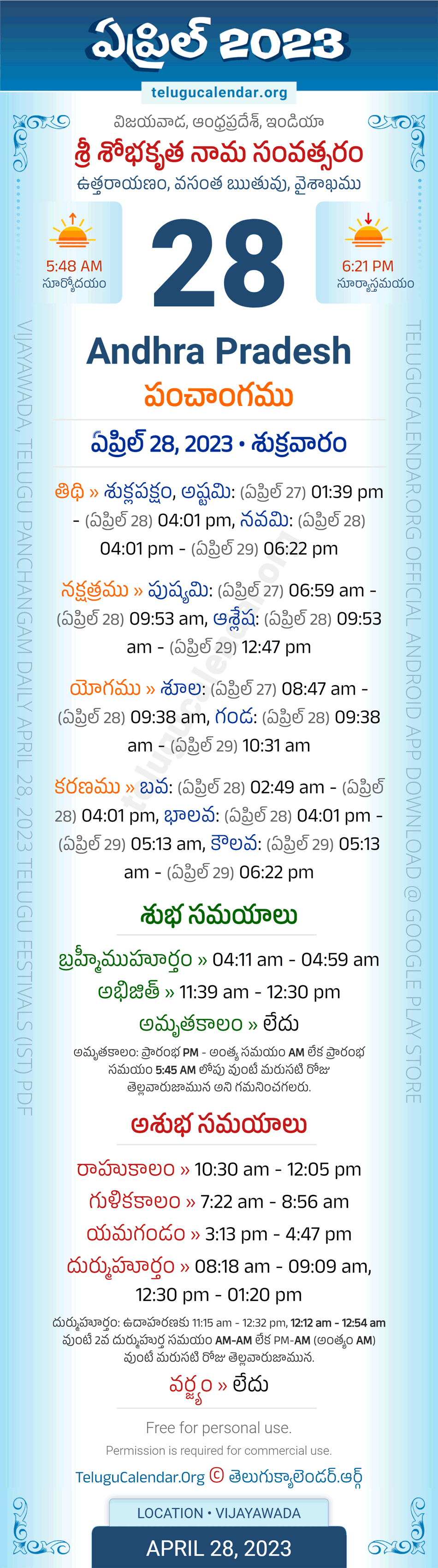 Download » April 28, 2023 » Andhra Pradesh (Vijayawada) Telugu Panchangam Daily Sheet with Auspicious and Inauspicious Timings.
