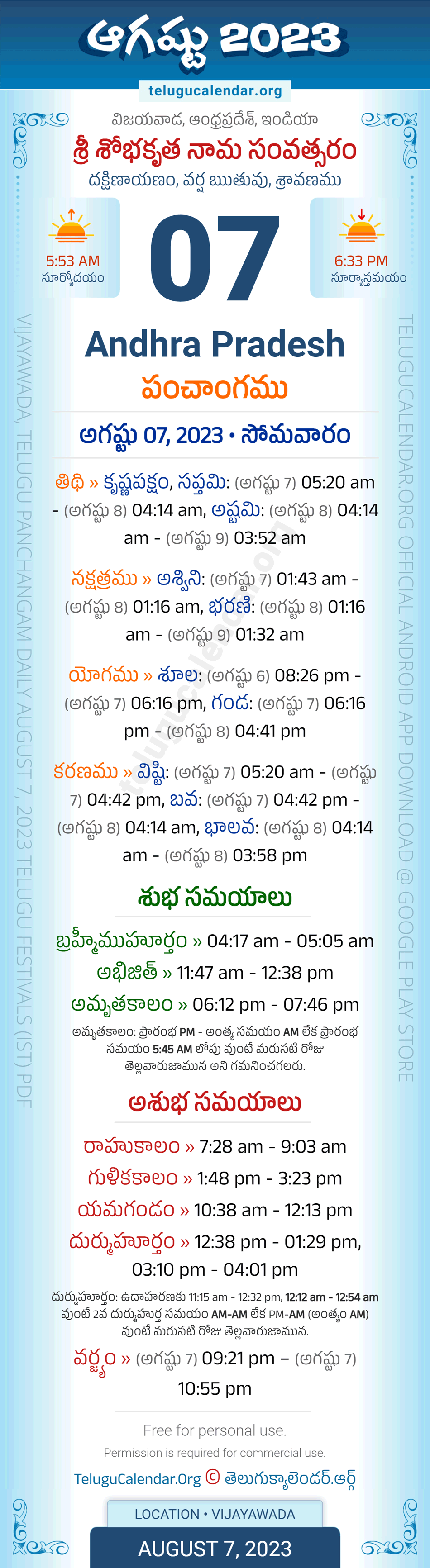 Download » August 7, 2023 » Andhra Pradesh (Vijayawada) Telugu Panchangam Daily Sheet with Auspicious and Inauspicious Timings.