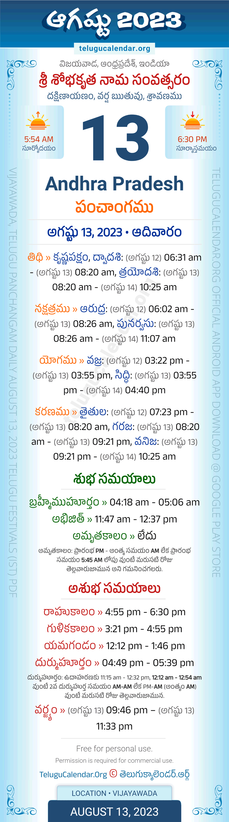 Download » August 13, 2023 » Andhra Pradesh (Vijayawada) Telugu Panchangam Daily Sheet with Auspicious and Inauspicious Timings.