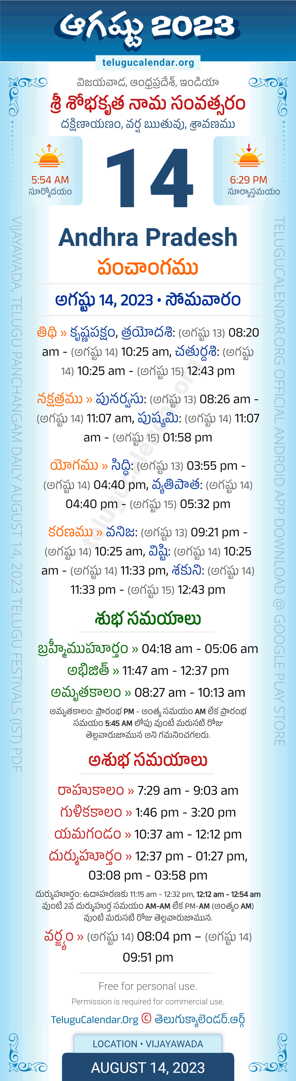 Download » August 14, 2023 » Andhra Pradesh (Vijayawada) Telugu Panchangam Daily Sheet with Auspicious and Inauspicious Timings.