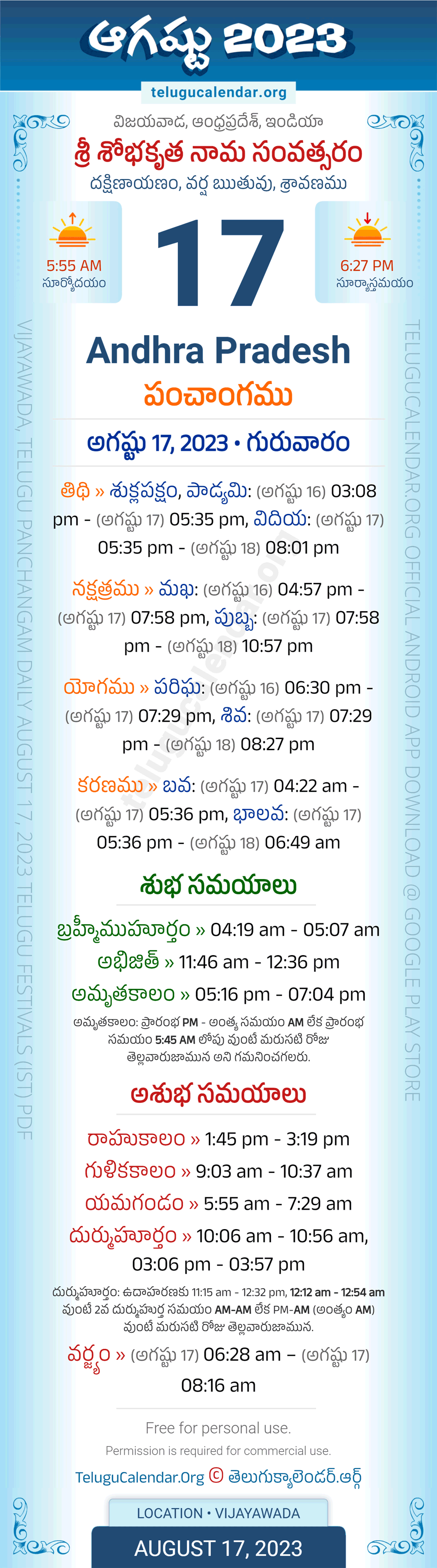 Download » August 17, 2023 » Andhra Pradesh (Vijayawada) Telugu Panchangam Daily Sheet with Auspicious and Inauspicious Timings.