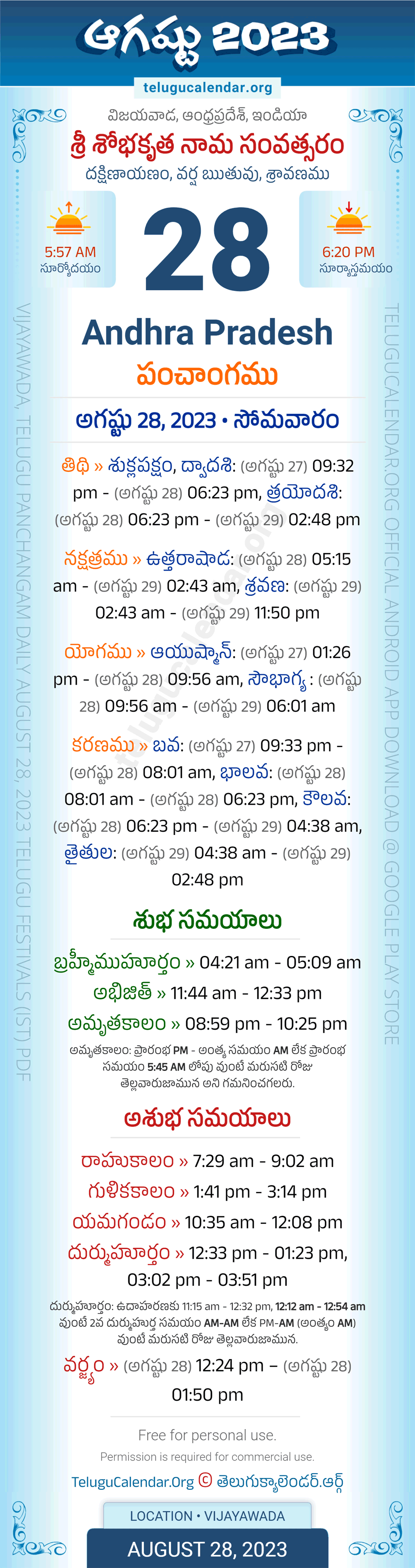 Download » August 28, 2023 » Andhra Pradesh (Vijayawada) Telugu Panchangam Daily Sheet with Auspicious and Inauspicious Timings.