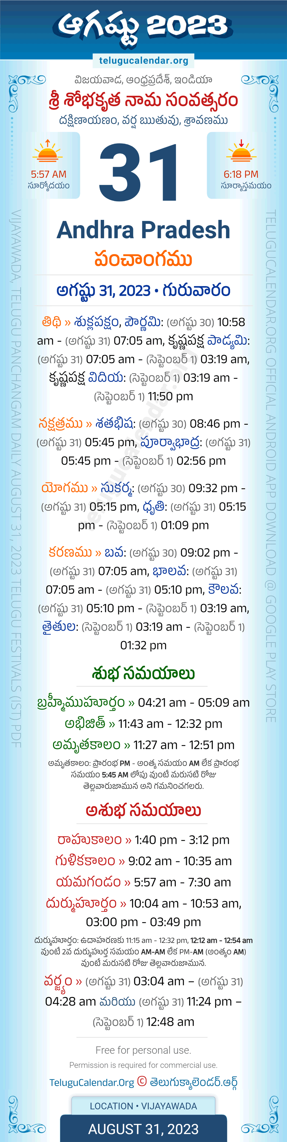 Apart from the Panchangam August 31, 2023 Andhra Pradesh Telugu Calendar Daily Sheet, you can also find the Sunrise and Sunset (Middle Limb) timings, Paksham, Telugu Year, Yanam, Rutuvu, Telugu Month. Today's Andhra Pradesh Auspicious Timings August 31, 2023 (Shubha Muhuratam Today Good Timings like Abhijit Muhurtham, Amruta Kalam & Brahma Muhurtham) and Today's Andhra Pradesh Inauspicious Timings August 31, 2023 (Bad Timings like Durmuhurtham, Rahukalam, Gulika kalam & Yamagandam) with starting and end timings in the above image.