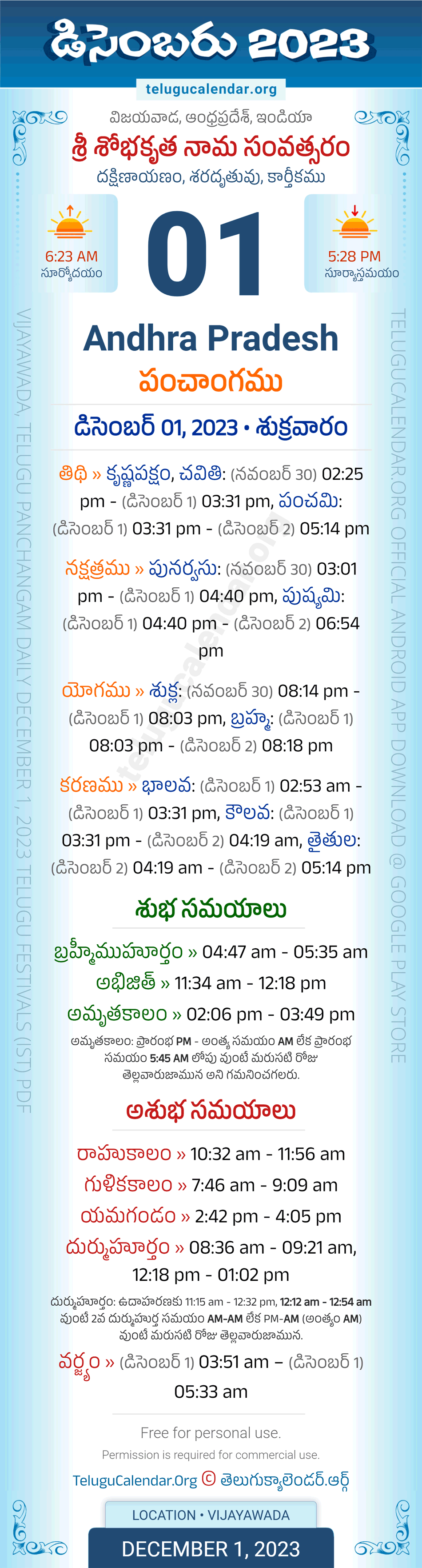 Download » December 1, 2023 » Andhra Pradesh (Vijayawada) Telugu Panchangam Daily Sheet with Auspicious and Inauspicious Timings.