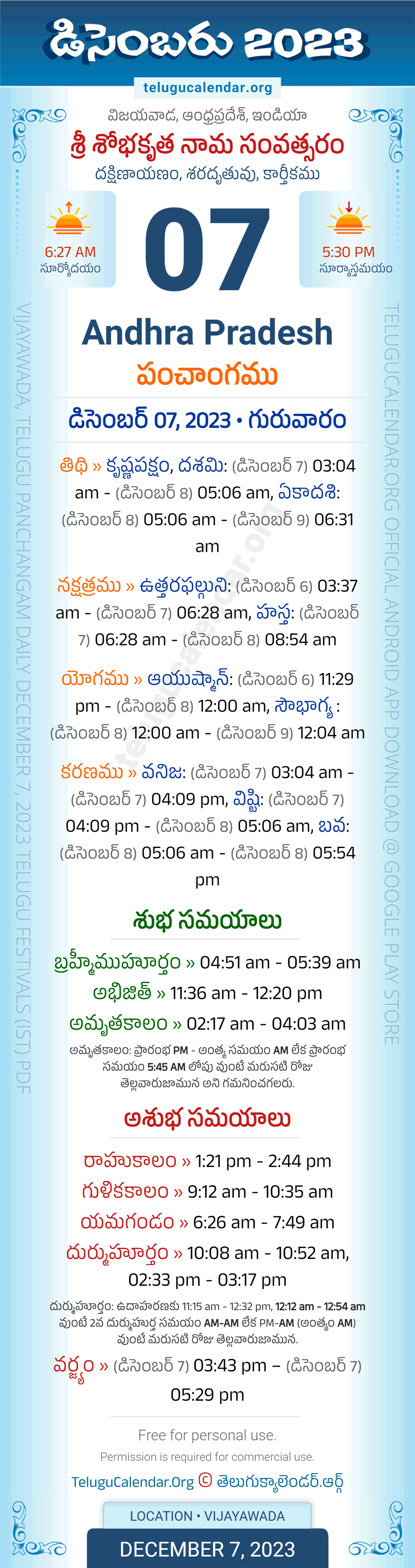 Download » December 7, 2023 » Andhra Pradesh (Vijayawada) Telugu Panchangam Daily Sheet with Auspicious and Inauspicious Timings.