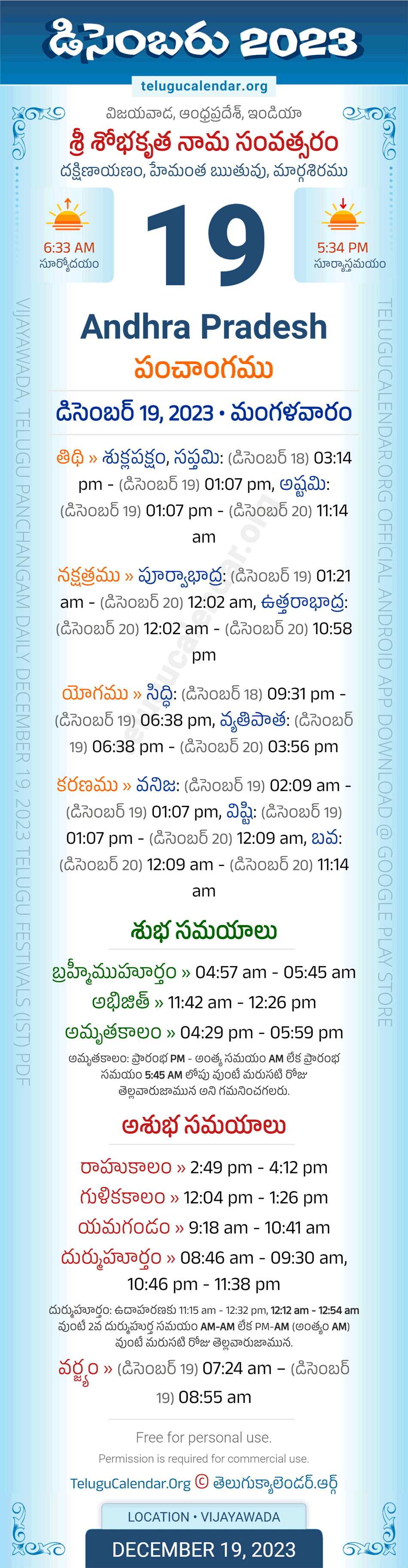 Download » December 19, 2023 » Andhra Pradesh (Vijayawada) Telugu Panchangam Daily Sheet with Auspicious and Inauspicious Timings.
