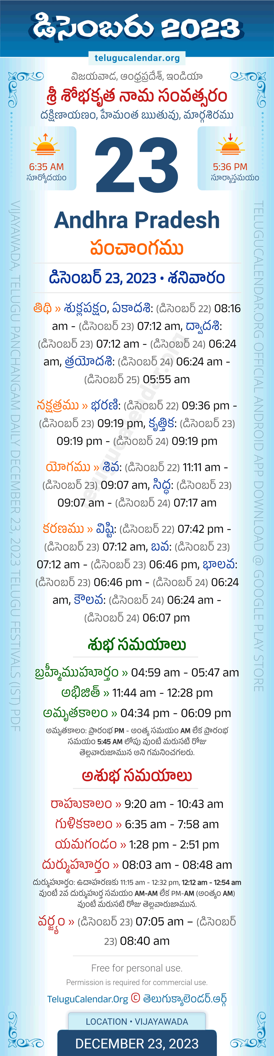 Download » December 23, 2023 » Andhra Pradesh (Vijayawada) Telugu Panchangam Daily Sheet with Auspicious and Inauspicious Timings.