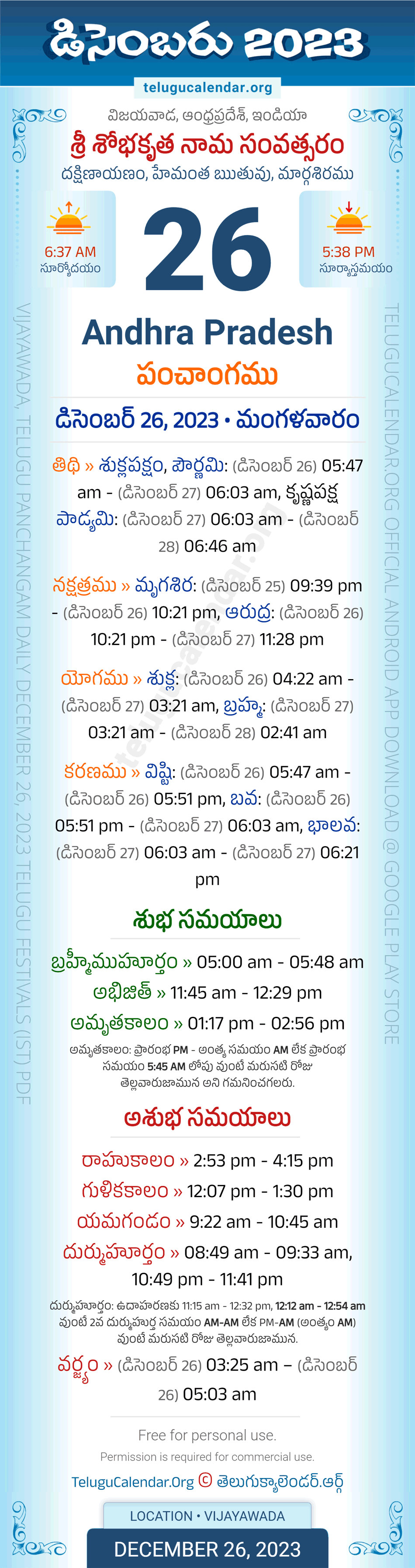 Download » December 26, 2023 » Andhra Pradesh (Vijayawada) Telugu Panchangam Daily Sheet with Auspicious and Inauspicious Timings.