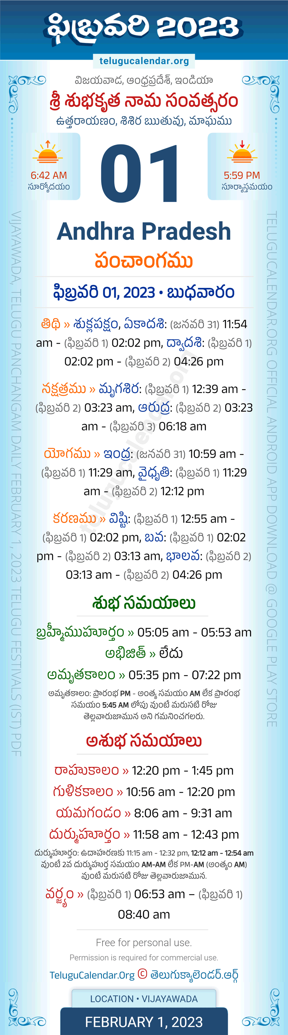 Download » February 1, 2023 » Andhra Pradesh (Vijayawada) Telugu Panchangam Daily Sheet with Auspicious and Inauspicious Timings.
