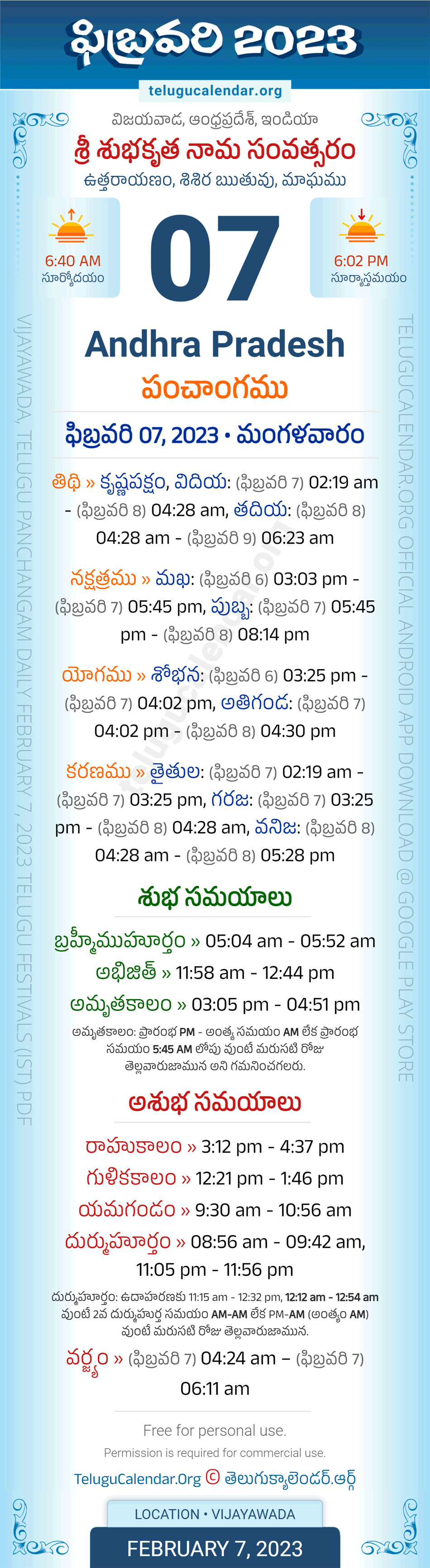 Download » February 7, 2023 » Andhra Pradesh (Vijayawada) Telugu Panchangam Daily Sheet with Auspicious and Inauspicious Timings.