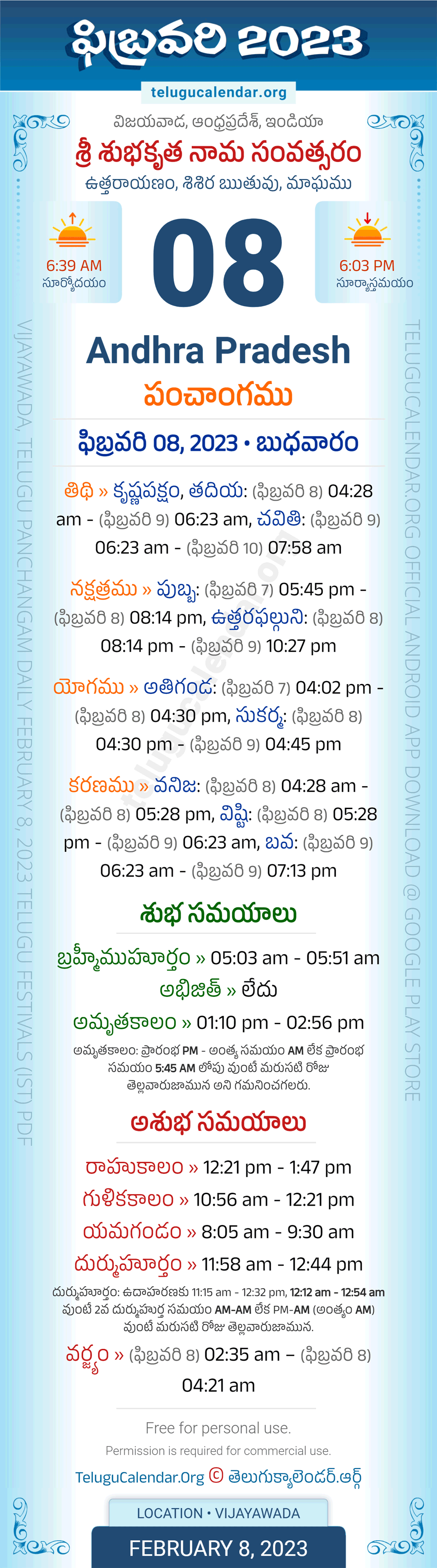 Download » February 8, 2023 » Andhra Pradesh (Vijayawada) Telugu Panchangam Daily Sheet with Auspicious and Inauspicious Timings.