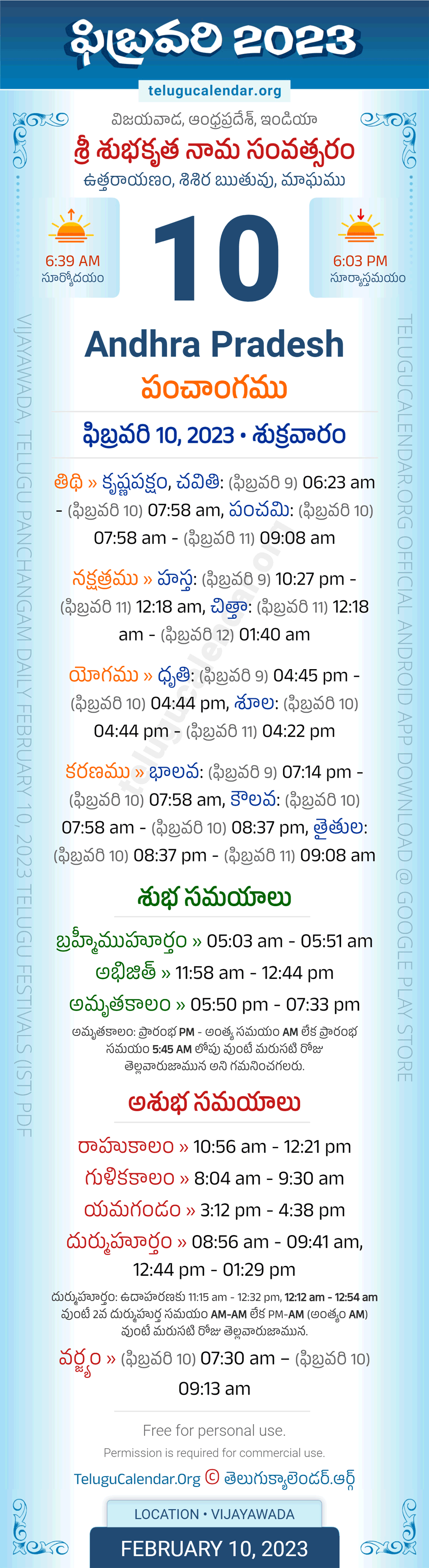 Download » February 10, 2023 » Andhra Pradesh (Vijayawada) Telugu Panchangam Daily Sheet with Auspicious and Inauspicious Timings.