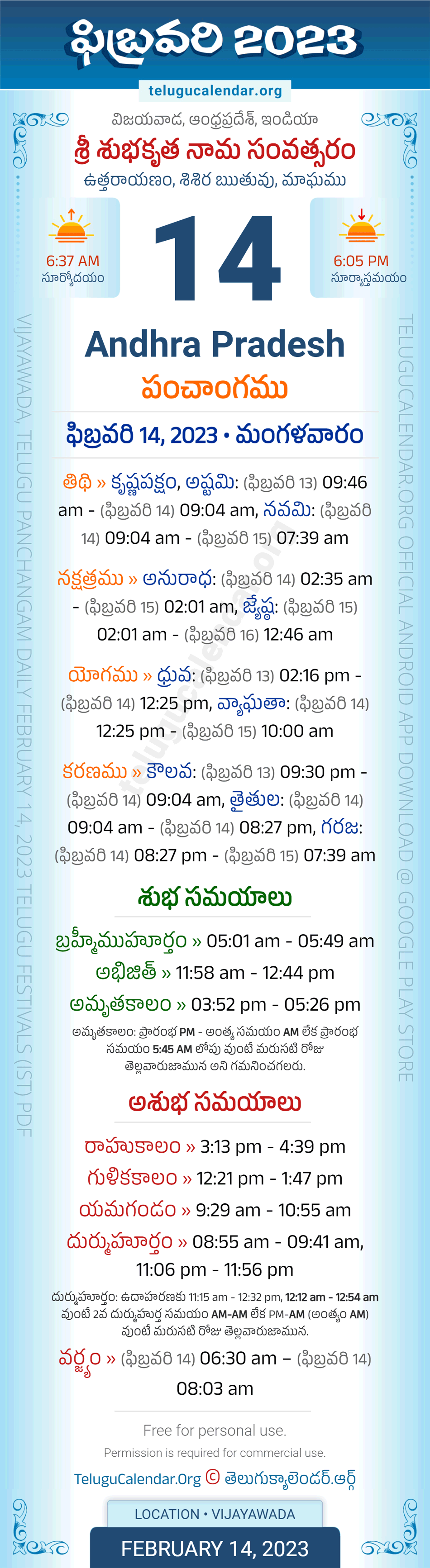 Download » February 14, 2023 » Andhra Pradesh (Vijayawada) Telugu Panchangam Daily Sheet with Auspicious and Inauspicious Timings.