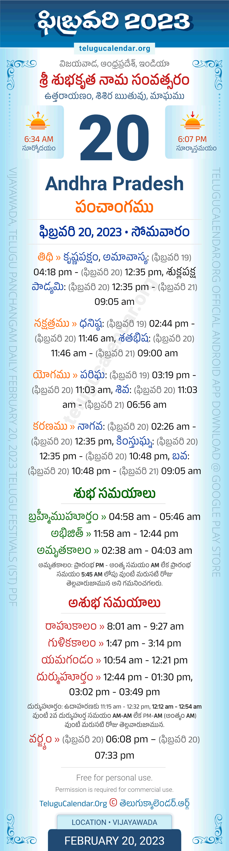 Apart from the Panchangam February 20, 2023 Andhra Pradesh Telugu Calendar Daily Sheet, you can also find the Sunrise and Sunset (Middle Limb) timings, Paksham, Telugu Year, Yanam, Rutuvu, Telugu Month. Today's Andhra Pradesh Auspicious Timings February 20, 2023 (Shubha Muhuratam Today Good Timings like Abhijit Muhurtham, Amruta Kalam & Brahma Muhurtham) and Today's Andhra Pradesh Inauspicious Timings February 20, 2023 (Bad Timings like Durmuhurtham, Rahukalam, Gulika kalam & Yamagandam) with starting and end timings in the above image.