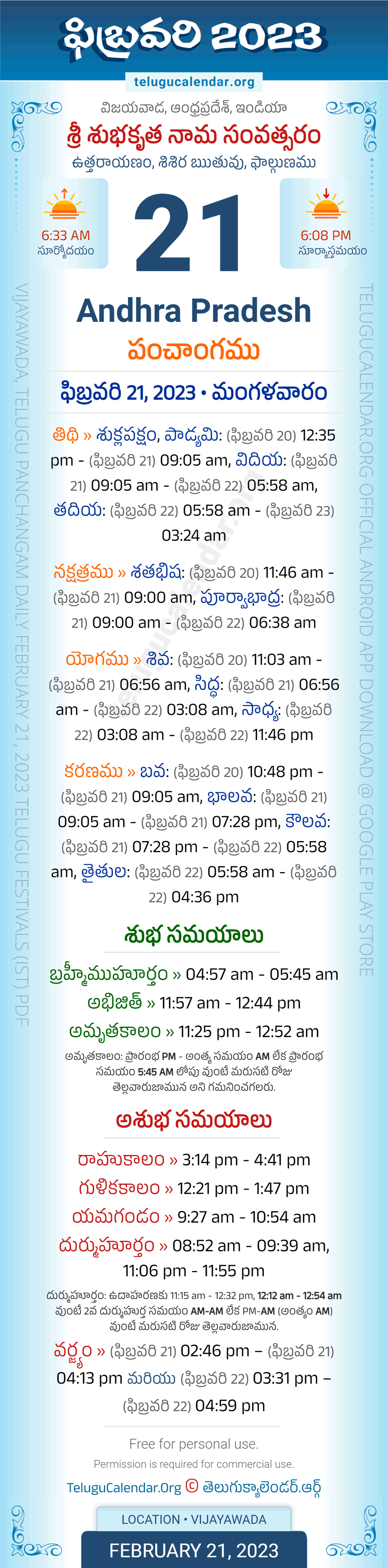 Download » February 21, 2023 » Andhra Pradesh (Vijayawada) Telugu Panchangam Daily Sheet with Auspicious and Inauspicious Timings.