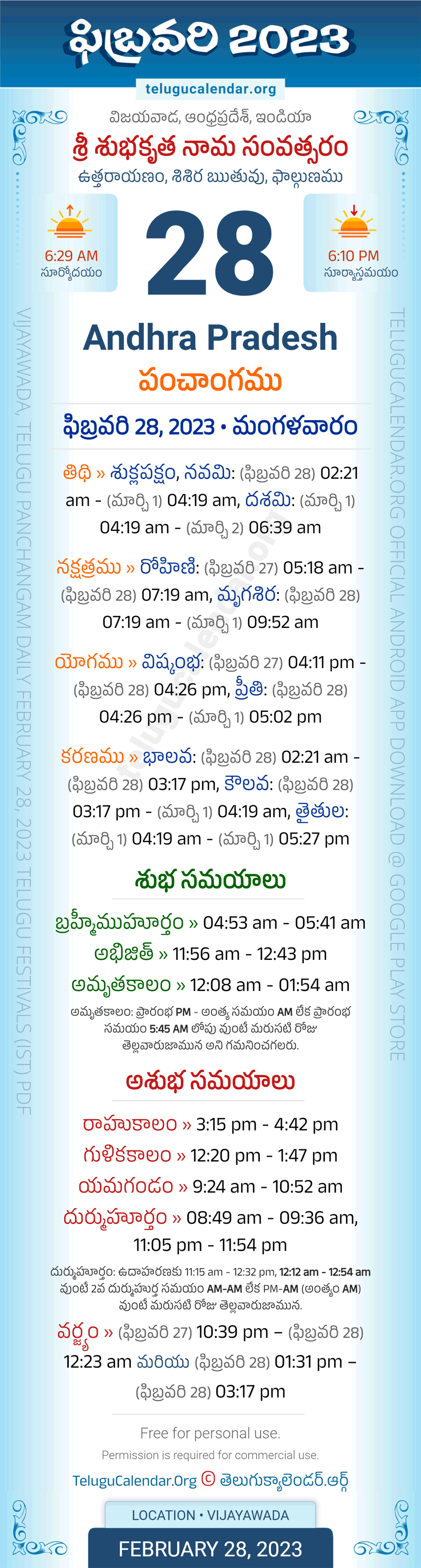 Download » February 28, 2023 » Andhra Pradesh (Vijayawada) Telugu Panchangam Daily Sheet with Auspicious and Inauspicious Timings.