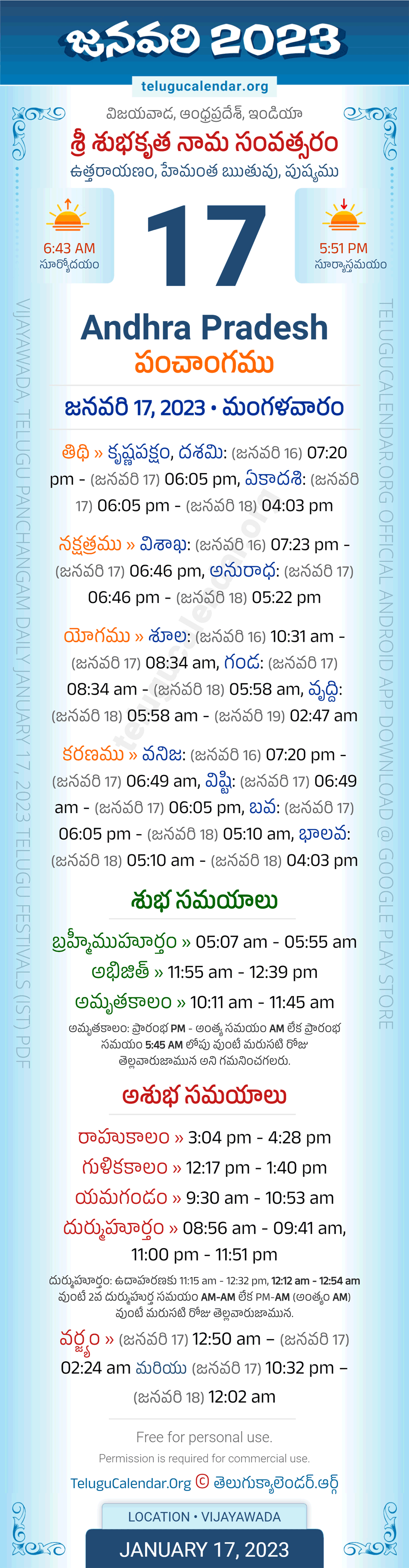 Andhra Pradesh Panchangam January 17, 2023 Daily Sheet in Telugu... Andhra Pradesh Telugu Panchangam Tuesday, January 17, 2023, Today's Andhra Pradesh Tithi: Krishna Paksham, Dashami: (Jan 16) 07:20 pm - (Jan 17) 06:05 pm, Ekadashi: (Jan 17) 06:05 pm - (Jan 18) 04:03 pm, Today's Andhra Pradesh Nakshatram: Visakha: (Jan 16) 07:23 pm - (Jan 17) 06:46 pm, Anuradha: (Jan 17) 06:46 pm - (Jan 18) 05:22 pm, Telugu Year: Sri Subhakritu Nama Samvatsaram, Vedic Aayana: Uttarayanam, Vedic Rutuvu: Hemanta, Chandramasa (Amanta): Pushyamu. Below image showing information about the 5 attributes of the day, viz., Varam, Tithi, Nakshatram, Yogam & Karanam along with starting and end timings. Read more