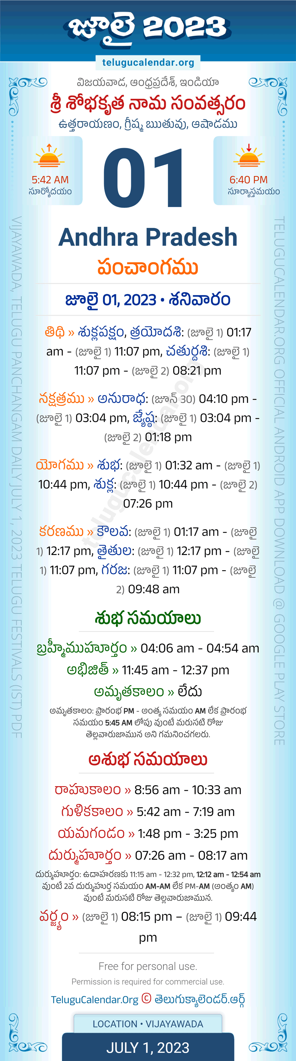 Download » July 1, 2023 » Andhra Pradesh (Vijayawada) Telugu Panchangam Daily Sheet with Auspicious and Inauspicious Timings.