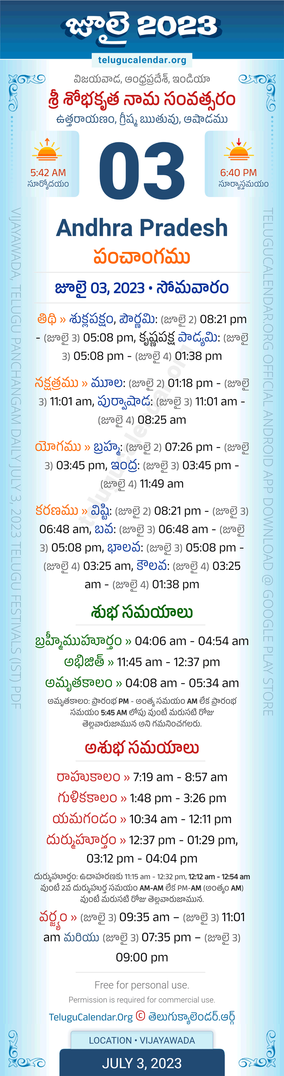 Download » July 3, 2023 » Andhra Pradesh (Vijayawada) Telugu Panchangam Daily Sheet with Auspicious and Inauspicious Timings.
