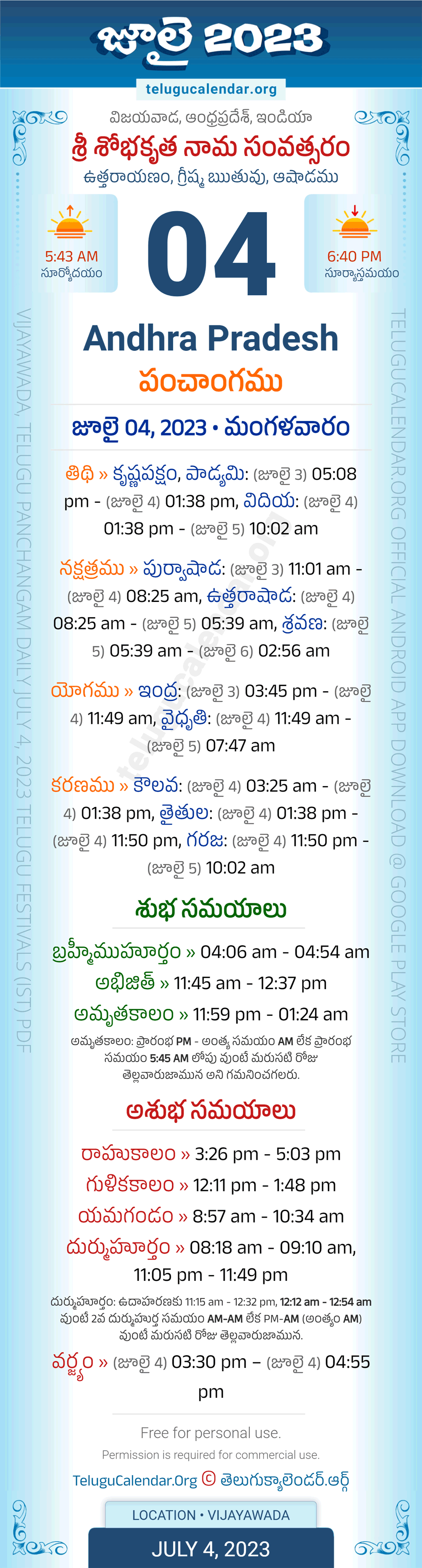 Download » July 4, 2023 » Andhra Pradesh (Vijayawada) Telugu Panchangam Daily Sheet with Auspicious and Inauspicious Timings.