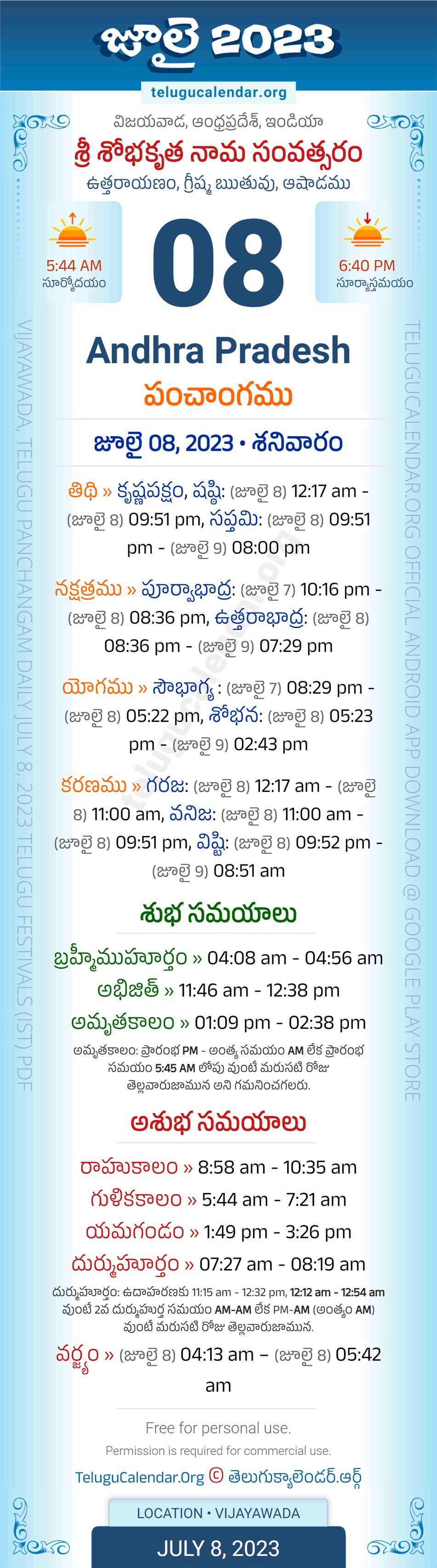 Download » July 8, 2023 » Andhra Pradesh (Vijayawada) Telugu Panchangam Daily Sheet with Auspicious and Inauspicious Timings.