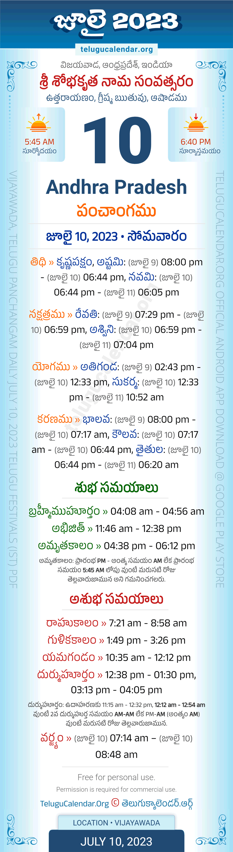 Download » July 10, 2023 » Andhra Pradesh (Vijayawada) Telugu Panchangam Daily Sheet with Auspicious and Inauspicious Timings.