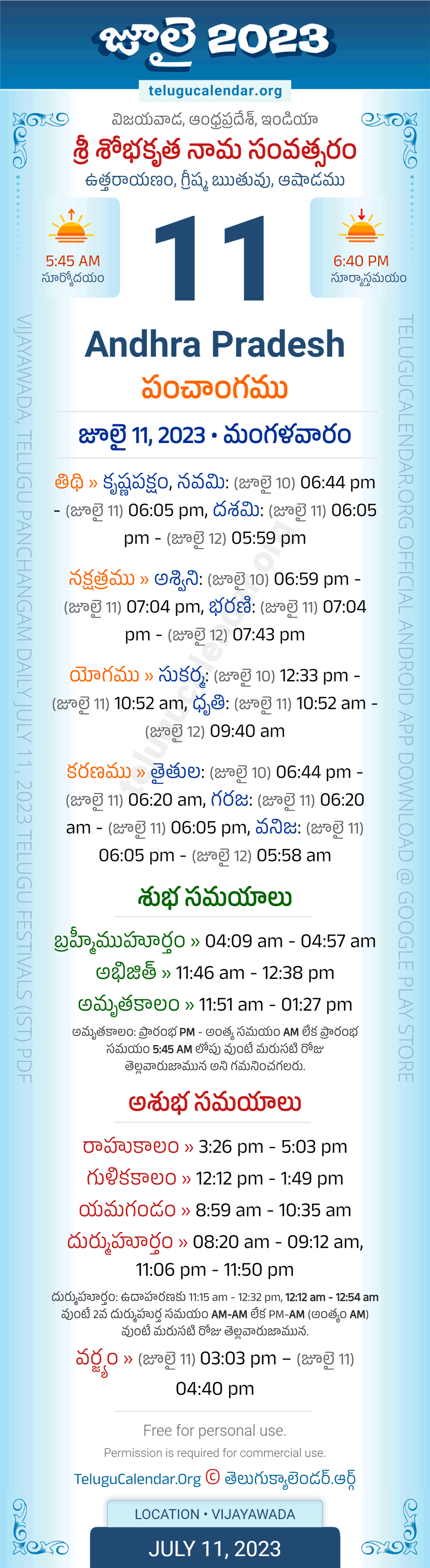 Download » July 11, 2023 » Andhra Pradesh (Vijayawada) Telugu Panchangam Daily Sheet with Auspicious and Inauspicious Timings.